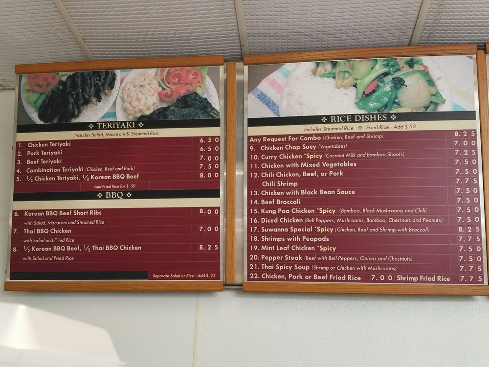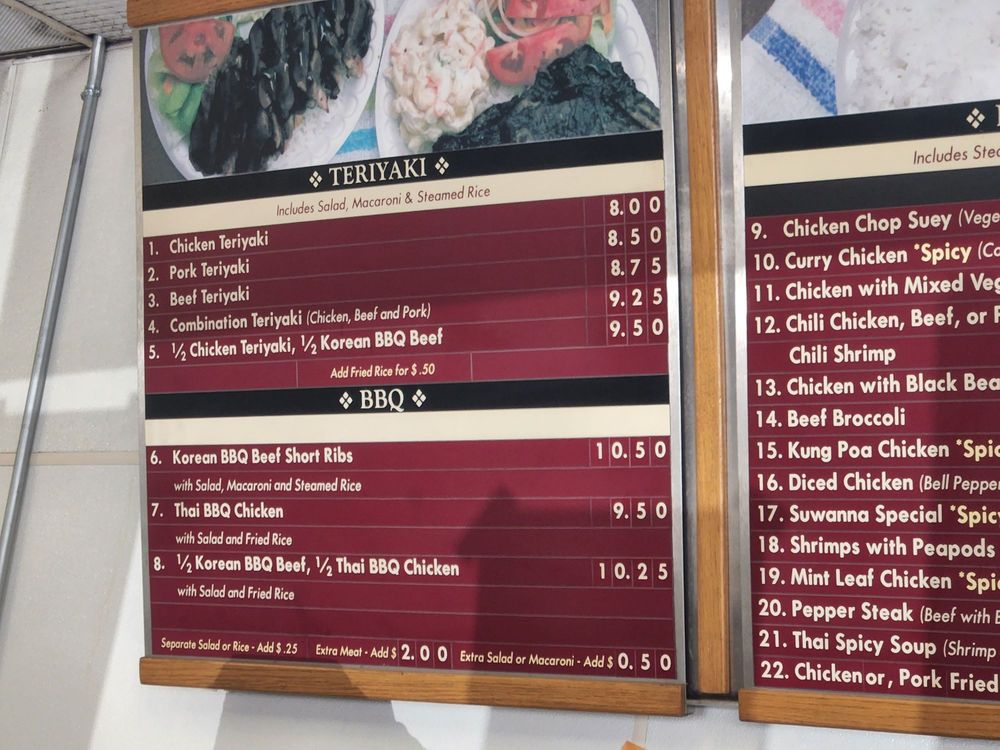 Grilled Chicken, Pork and Beef topped with teriyaki sauce on steamed rice. Including green salad and macaroni salad. Any modified order will be an additional charge.